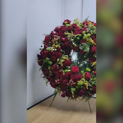 Coroana funerara cu trandafiri, crizanteme, hipericum si solidago