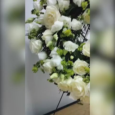 Coroana funerara cu trandafiri si lisianthus (eustoma) albe