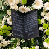 Card funerar negru cu scris alb pentru mesaj de condoleante atasat pe aranjamentul funerar